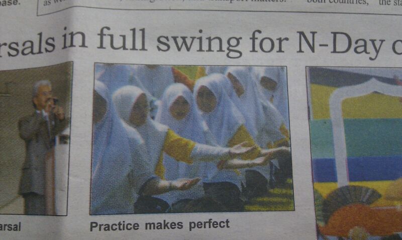 Anyway, this is a post about something that really shocked me and made me even more happier. This happened sometime in February 2005 during the national day, collaboration with some secondary school. I was studying in STPRI and he was at Hasan School. It was like a dream came true. Allah memang dari mula sudah mentakdirkan kitani untuk bersama. Alhamdulillah! He (my Ami) once told me a story about a girl he met during the national day rehearsal. He said he liked this girl, but always didn't get the chance to talk to her. The first time he saw was at Padang Belapan and the second time was at Padang SOAS. I teased him, maybe that was me. He just yeah right! :P He forgot already how the girl looked like so yeah, I just skipped that part. Recently, few days ago when I was rummaging my stuffs I found a piece of folded newspaper. When I unfolded it, I saw me printed on the Bulletin. Then I quickly took my phone and snap a picture of it and sent to him to show him that was me. He was like "Remember the girl I told you, it was actually you when I saw this picture!" I was smiling happily, didn't believe how that could possibly be me. I asked him many times was he really sure that was really really me and he said yes, confidently yes you are! I was like "Wowwwww!" He met me and knew me before I even knew him. I asked him why you didn't say hi or gave a smile at least, that would be great. He said he was too shy and he said he only watched me from far. I never realized there was someone watching me and that time I barely knew any boys. Budak STPRI kan! hehe! It just ended like that when the national day event ended. That's how he met me for the very very very first time.
